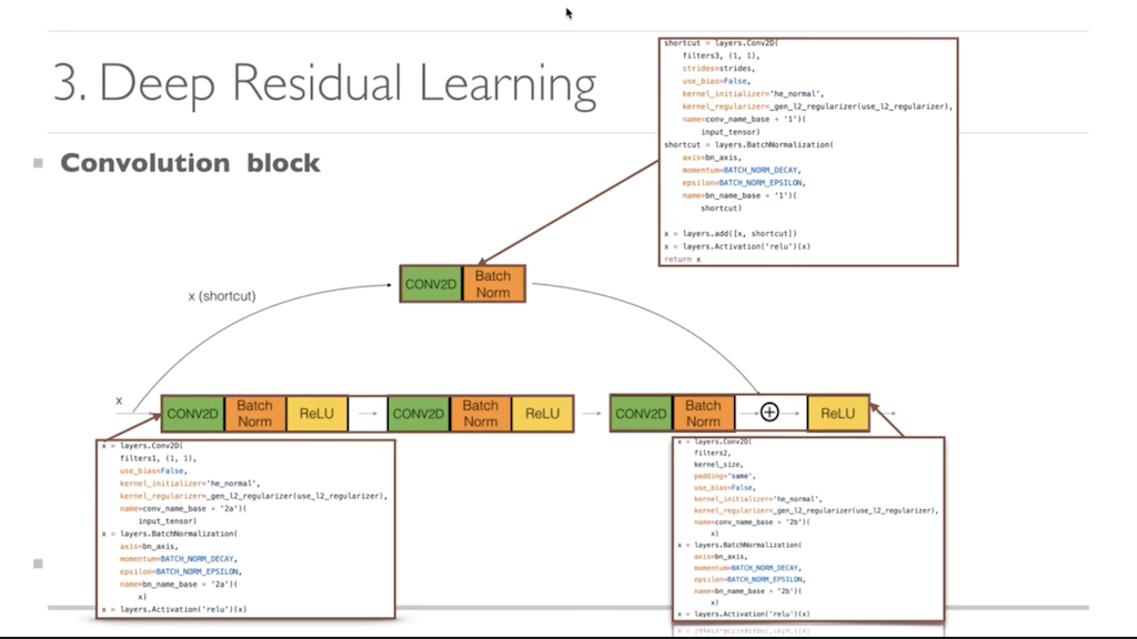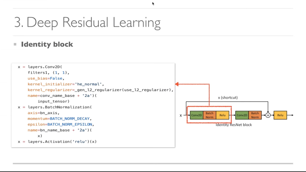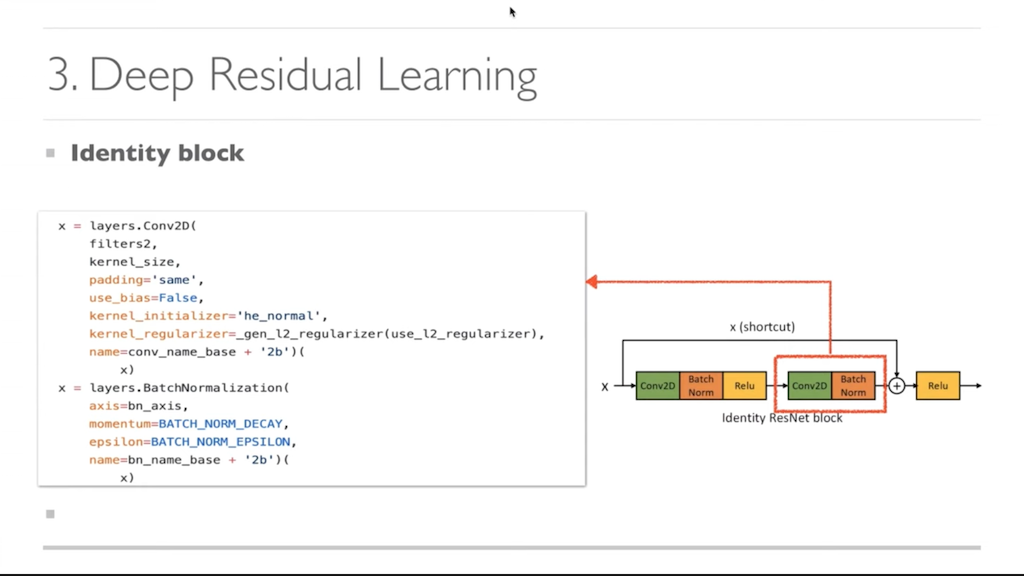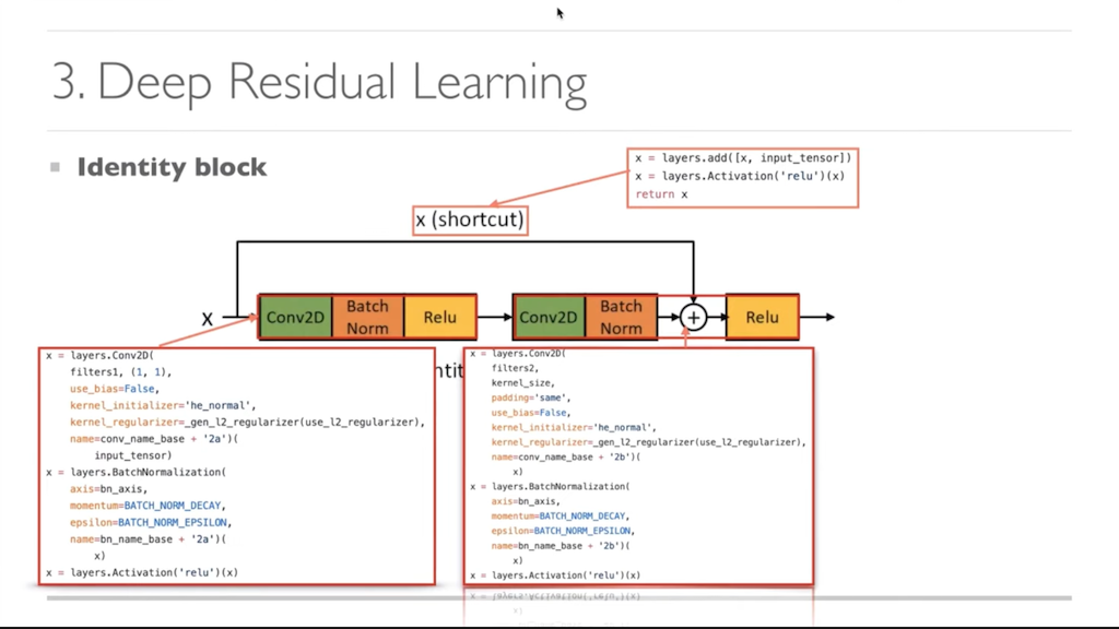 그 다음으로는 실제 코딩에서 ResNet이 어떻게 적용되는지 알아보겠습니다. 그림에서 확인해보시면, Identity block의 구조와 그것을 코딩으로 구현한 것입니다. 첫 번째 레이어에서는 Convolution layer를 통해서 진행되고 그다음에 batchNormalization과 activation function인 ReLU에 입력값이 지나게 됩니다.