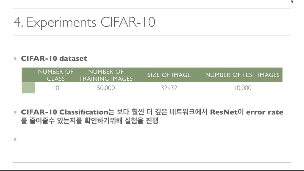 두 번째 실험으로써, CIFAR-10 데이터셋을 이용하는 실험입니다. imagenet classification과 달리 CIFAR-10 데이터셋은 32×32 작은 이미지 입니다. 왜냐하면 좀 더 깊은 훨씬 더 깊은 네트워크의 ResNet을 실험하기 위함 입니다.