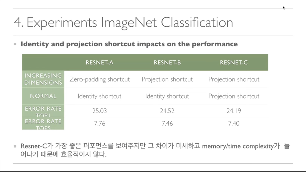 그 다음으로, Identity shortcut과 Projection shortcut 이 ResNet에서 어떻게 쓰이는지 알아보는 실험입니다. 여기서는 세 가지 ResNet을 만듭니다. ResNet-A는 identity 쇼커만 사용하는 ResNet이고 ResNet-B는 Projection shortcut과 Identity shortcut을 혼합하는 모델입니다. 마지막으로 ResNet-C는 Projection shortcut만 사용하는 ResNet입니다. error rate를 보시면 ResNet-A보다 ResNet-B가 좀 더 좋은 퍼포먼스를 보여주고 ResNet-B보다 ResNet-C가 좀 더 좋은 퍼포먼스를 보여줍니다. 하지만 그 차이가 미세하고 ResNet-A보다 ResNet-C가 메모리 타임 complexity가 훨씬 높기 때문에, 효율적이지 않다고 여겨서, 이 논문에서는 별 차이가 없다고 설명합니다.