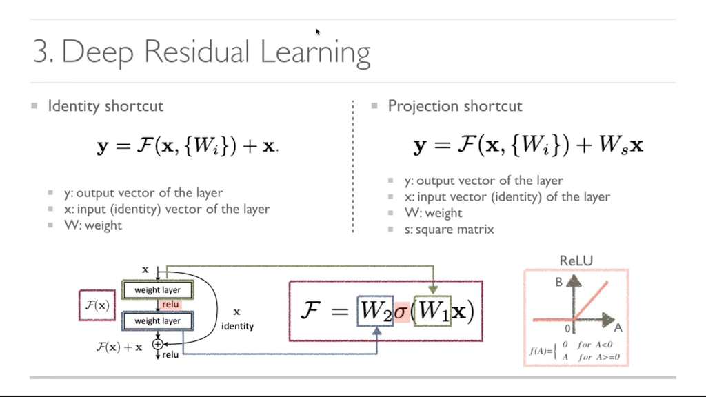resnet에서는 중요한 제약 조건이 있는데, 입력값 x와 출력값 y의 dimension이 항상 같아야 더하기 연산을 수행할 수 있습니다. 그렇기 때문에 입력 값을 출력값으로 바로 보내주는 shortcut이 두 가지가 존재하는데 Identity shortcut은 입력값 x와 출력값 y의 dimension 이 같을 경우 사용되는 것입니다. 반면 projection shortcut은 x와 y의 dimonsion이 다른 경우, square matrix인 Ws를 통해서 x와 y의 dimension을 맞춰주는 경우입니다.