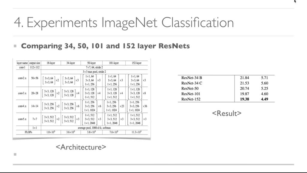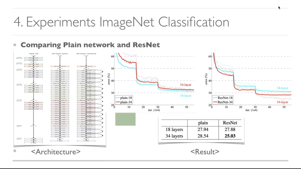 앞선 과정으로 layer를 늘려서, 그림 architecture table에서 보시는 것처럼, layer가 늘어나는 것을 알 수 있습니다. layer가 늘어남에 따라서, 오른쪽 result table을 보시면, error rate가 점점 낮아지는 것을 알 수 있습니다. 이 실험을 통해서 ResNet은 layer가 늘어남에 따라 Degradation 문제가 발생하지 않는 것을 알 수 있습니다.