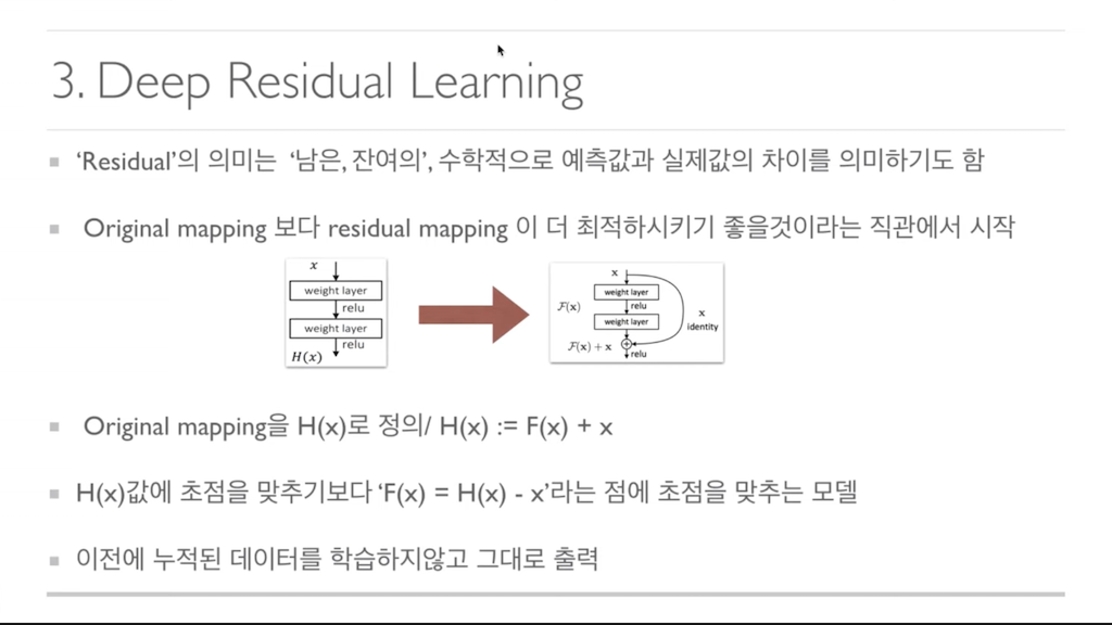 본격적으로 resnet에 대해서 알아보기 전에, residual의 사전적인 의미를 알아보면 ‘남은’, ‘잔여의’ 라는 뜻입니다. 또한 수학적인 관점에서 residual을 본다면 예측값과 실제 값의 차이를 의미합니다. 이런 의미를 기억하고 resnet의 원리를 이해하면 좀 더 편하게 접근할 수도 있습니다. resnet은 기본적으로 수학적인 배경에서 나온 개념이라기보다는, 오리지널 매핑보다 레스 듀얼 매핑이 더 최적화하기 쉬울 것이라는 직관에 의해서 시작된 개념입니다. 오리지널 매핑은 입력값 x를 모두 학습하지만 resdual 매핑은 타겟과 입력 사이의 차이점만 학습하겠다는 개념입니다. 그림에서 보시면 H(x)가 목표 출력값이라고 정의할 때, 왼쪽에 보이는 flow가 일반 network flow입니다. 일반 network에서는 x 전체를 학습하지만, 오른쪽 flow를 보시면 resnet network에서는 f(x) 즉, 입력값과 출력 값의 차이만 학습하게 됩니다. 이러한 관점의 전환으로 최적화의 경우 fx가 0이 되어야 하기 때문에, 학습할 방향이 미리 결정되어 precondition 역할을 하게 됩니다. f(x)가 거의 0이 되는 방향으로 학습하게 되면 입력 x의 작은 움직임을 쉽게 검출할 수 있기 때문에 특징을 뽑아내기도 좀 더 수월합니다.