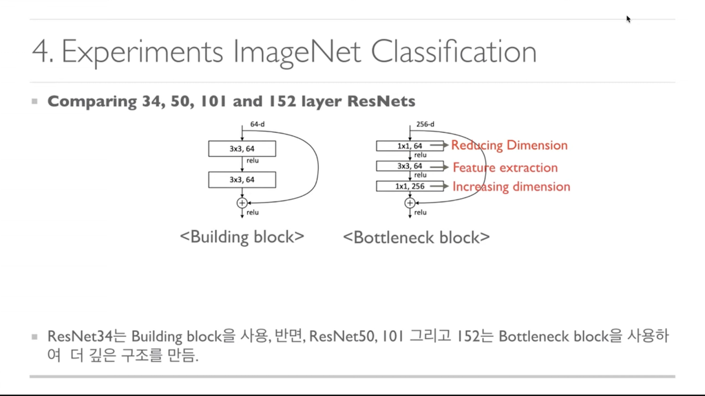 마지막으로 ResNet의 layer가 깊어짐에 따라 Degradation 문제가 일어나는지 확인하는 실험입니다. ResNet 34에서는 building block을 사용하는 반면 ResNet 50 101 그리고 152에서는 Bottleneck block을 사용하여 더 깊은 구조를 만듭니다. bottleneck을 보시면 첫 번째에서는 256 dimension을 64 dimension으로 parameter를 줄이기 위해서 dimension을 줄여줍니다. 그리고 3×3 layer를 통해서 feature를 추출하고 마지막 레이어에서 다시 256 layer로 맞추기 위해서 dimension을 다시 늘려줍니다.