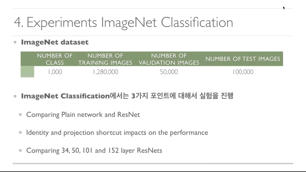 이 논문은 두 가지 실험을 통해 resnet의 성능과 특징을 나타냅니다. 첫 번째 실험인 image classification에서는 세 가지 포인트에 대해서 실험을 진행합니다. 첫 번째로 Plain network와 ResNet network를 비교하는 실험을 진행 하고, 다음으로 Identity shortcut과 Projection shortcut이 ResNet의 performance에 어떤 영향을 미치는지에 대한 두 번째 포인트에 대해서 실험을 진행하고, 마지막 포인트에서는 ResNet이 layer가 늘어남에 따라 Degradation 문제가 발생하지 않고, 효과적으로 error rate를 줄여줄 수 있는지 실험을 통해서 확인합니다.