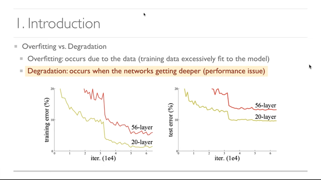 ResNet 논문에서는 많은 층으로 구성되어 있는 네트워크가 항상 좋은 퍼포먼스를 보여주는 것은 아니다 라고 시작하면서, 과거에는 많은 층으로 구성된 네트워크가 Overfitting 문제로 좋은 퍼포먼스를 보여주지 못하였음을 말합니다. 하지만 레이어 weite를 처음에 잘 초기화하고 좀 더 효율적인 normarization 방법으로, 이 문제가 어느 정도 해결되었고, 지금 상황에서는 Degradation 문제 때문에 많은 층으로 구성된 네트워크가 더 적은 층으로 구성되어 있는 네트워크에 비해 성능면에서 더 떨어지는 결과를 보여준다고 설명합니다.