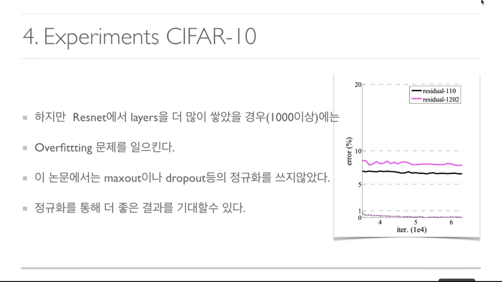하지만, ResNet에서 더 많은 레이어를 쌓을 경우, 위 그림상에서는 1202 layer를 쌓을 경우, overfitting 문제가 일어나는 것을 알 수 있습니다. 하지만 이 논문에서는 ResNet의 architecture만 소개하기 위해서, max out이나 drop out 같은 정규화를 쓰지 않았다고 합니다. 본 논문에서는, 정규화를 통해서 맥스아웃이나 드로아웃 같은 정교화를 통해서 좀 더 좋은 효과를 결과를 기대할 수 있다고 마무리 짓습니다.