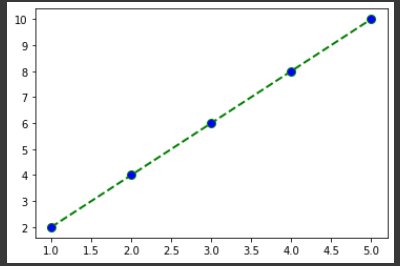 plt.plot(x, y, color='green', linestyle='dashed', linewidth=2, marker='o', markerfacecolor='blue', markersize=8)