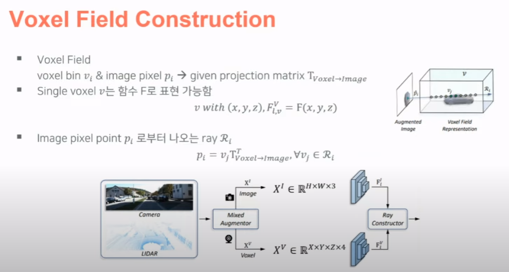 LiDAR를 이용하다 얻은 Point cloud data와 카메라에서 얻은 rgb Data를 어떻게 블렌딩 하면 효과적인지 그 방법을 제시하고 있습니다. 결과적으로 Voxel field에 augmented 된 이미지 feature를 ray 형식으로 나타내서 서로 다른 양식의 Data를 사용해도 일관성을 유지하도록 하는 것이 이 논문에서 제시하는 framework의 목적입니다.