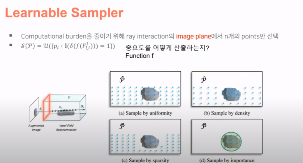 learnable sampler는 앞서 말씀드렸듯이 computational burden을 줄이기 위해 제시했으며 기존의 방법과 달리 중요도에 따라 sampling 하는 방식을 제시했습니다. 왼쪽 그림에서 빨간색 박스로 표시된 ray가 투영됐을 때를 나타냅니다.