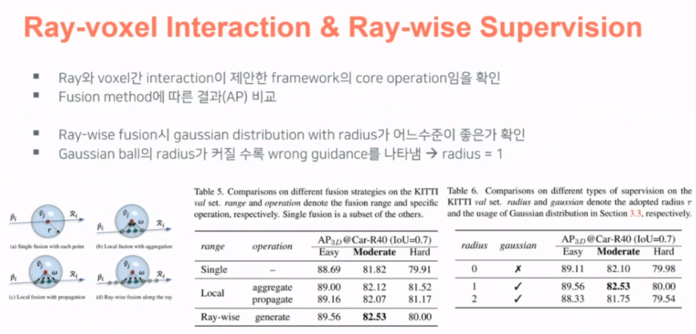 오른쪽 그림에 빨간 점은 LiDAR point들을 나타내고 있습니다. 초록점들은 ray Ri에 위치한 Voxel bin들 중 반지름 r이 원 안에 있는 점 vj 들로 나타냅니다. 오른쪽 그림에 있는 간단한 훈련방법인 single fusion에 대해 나타나고 있고 이는 주방 3D context에 대한 값이 고려하지 않고 LiDAR 센서 값만을 사용하는 방법입니다. 이후로 Co fusion방법이 나타났고 이는 인지장력을 반지름 r을 space V로 확장시킨 방법입니다. 이때 반지름 r의 영역은 Gaussian ball을 사용하여서 영역을 설정하였습니다.