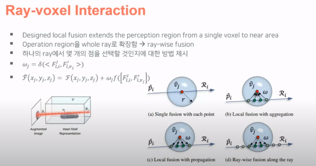 마지막으로 Ray wise fusion 같은 경우는 한 ray를 따라 있는 가운데 있는 Voxel field fusion이라는 박스를 보시면 알 수 있듯이 하나의 ray를 따라서 있는 feature를 fuse 하고 combine 하는 방식을 제시하고 있습니다.
