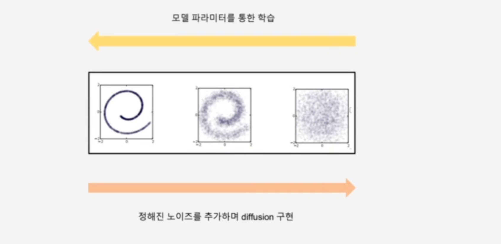 그렇다면 Equilibrium 상태에서 high Density로 모델이 학습할 수 있을까에 대한 아이디어에서 이 모델이 시작되었다고 볼 수 있고 이 부분은 통계학에서도 동일하게 적용이 되어서 complex 한 distribution에서 noise가 굉장히 많은 prior distribution으로 갈 때 모델이 거꾸로 학습할 수 있을까에 대한 아이디어로 시작되게 됩니다.