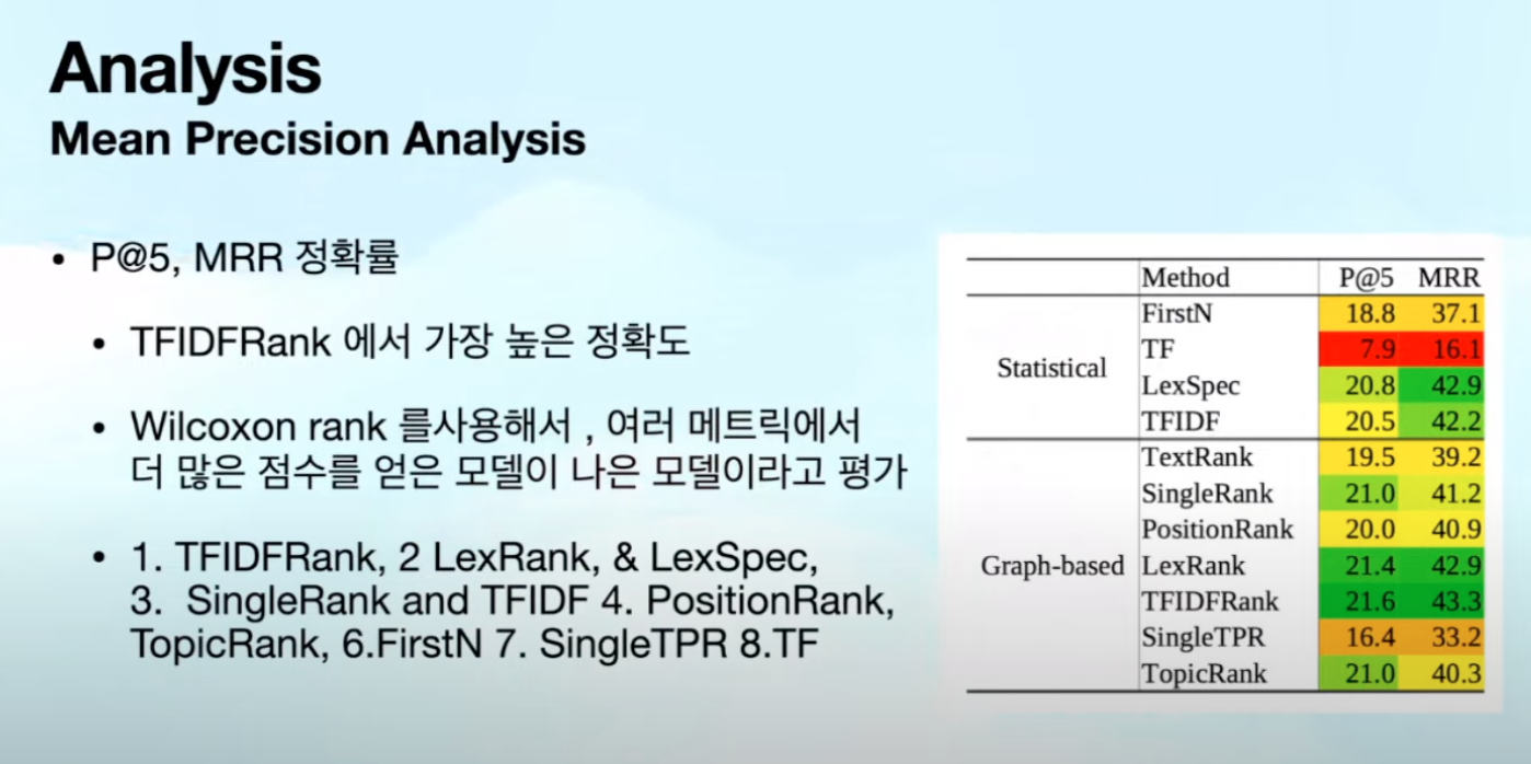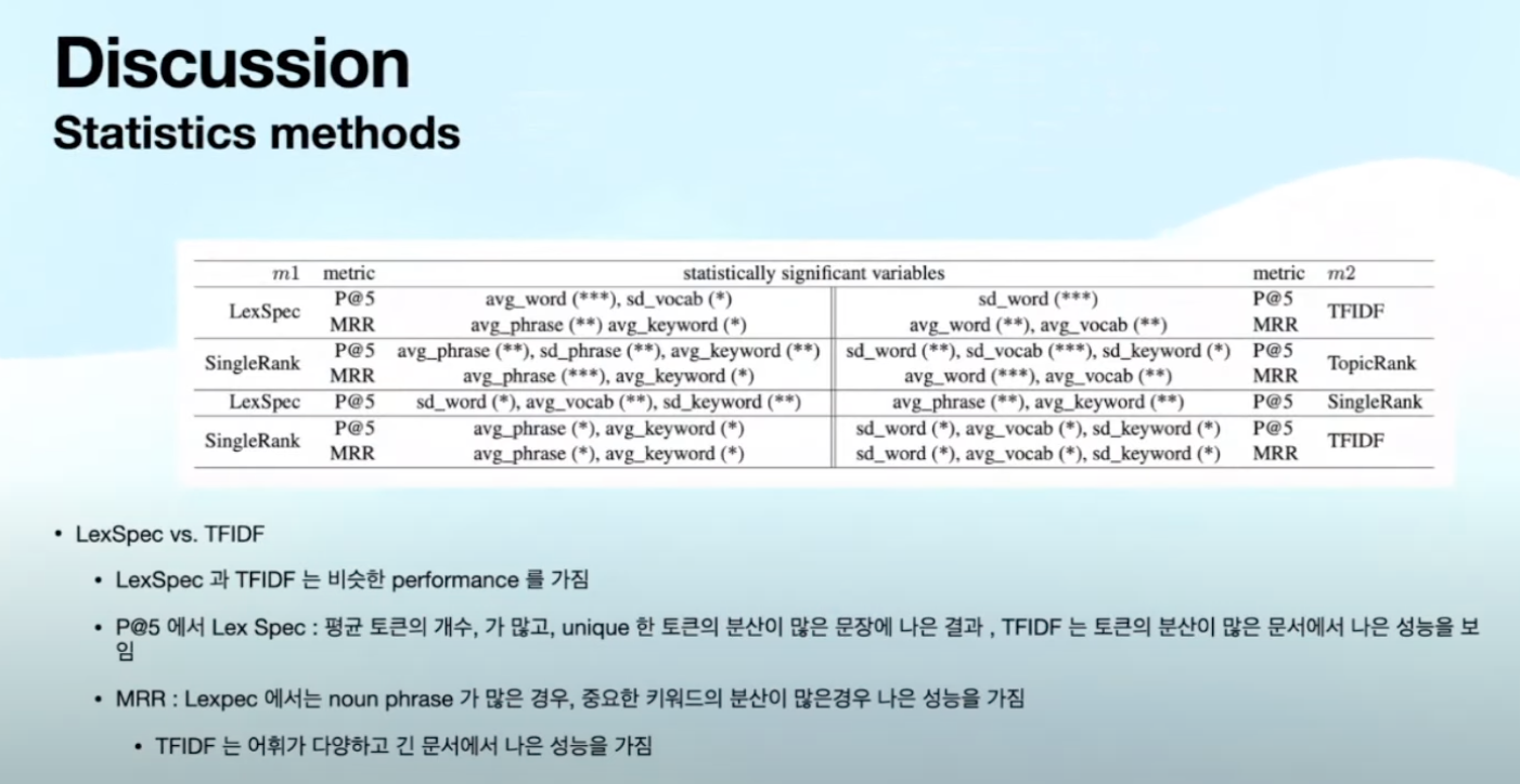 마지막으로는 통계 모델과 그래프 기반의 모델을 비교했을 때 P@5 점수에서는 SingleRank가 높은 평균을 가진 반면에 MRR에서는 통계적 모델이 더 나은 결과를 가졌습니다. 그중에서도 LexRank가 가장 높은 점수를 같이 가졌습니다.