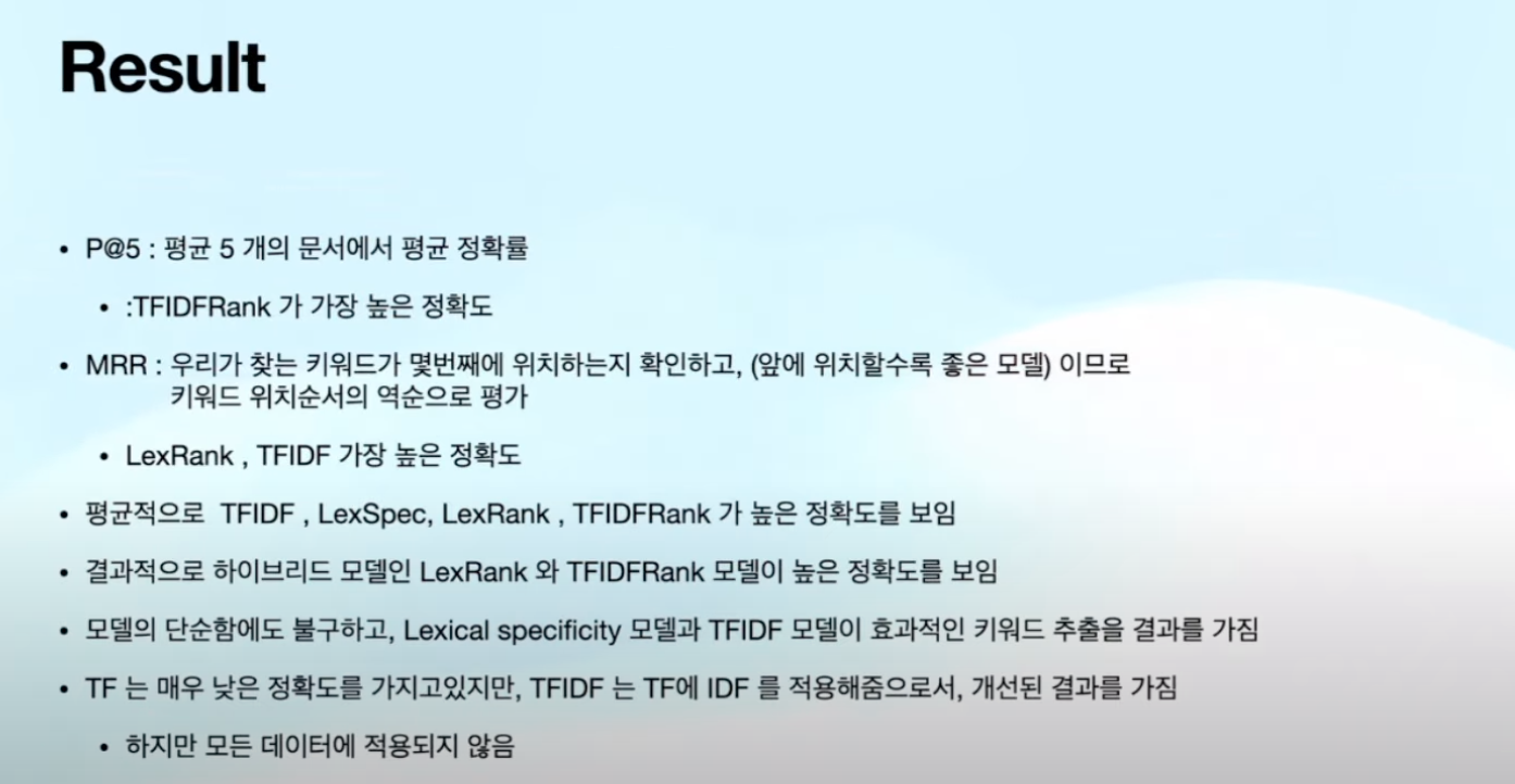 이렇게 큰 스케일의 비지도 키워드 추출 분석 모델들을 비교했습니다. term frequency를 사용하는 통계 모델들과 그래프를 사용하는 모델들을 비교해 봤습니다. 이 논문에서 얻은 결과는 많이 사용되는 TF-idf 모델보다 덜 사용되는 Lexical 모델이 더 나은 성능을 가지고 Graph-based model 같은 경우에는 문서의 종류별로 다양한 성능을 가진다는 것을 알 수 있었습니다.