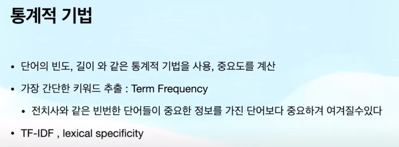 통계적 기법은 단어 레벨에서 단어의 빈도 또는 길이와 같은 통계적 기법을 사용해서 단어의 중요도를 계산하는 방법입니다.