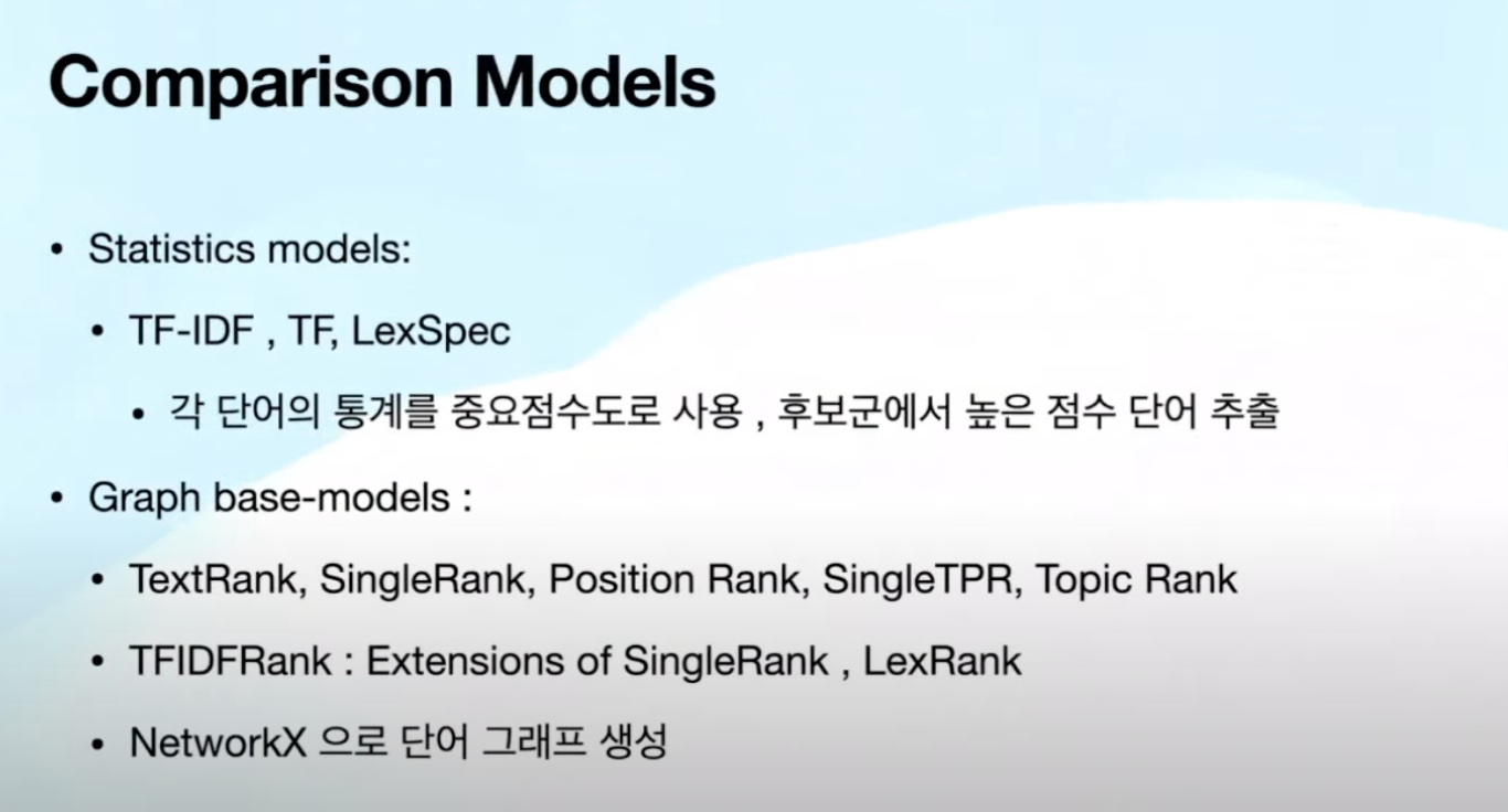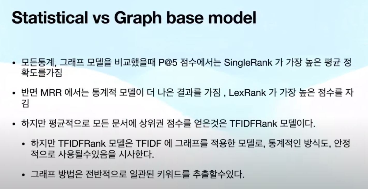 Graph base-model은 NetworkX라는 라이브러리로 단어 그래프를 생성해서 만들어 주었고 Grapg-base 모델과 statistic을 합친 하이브리드 모델로는 TF-idfRank와 TFLexRank라는 모델을 사용했습니다.