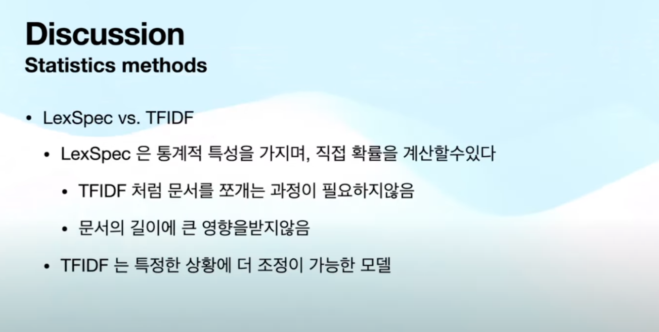 하지만 TF-idf는 특정한 상황에서 조정이 가능하고 더 적합하게 만들 수 있는 모델로 general 한 상황에서는 LexSpec 모델이 좋지만 특정한 상황에서는 TF-idf 모델이 더 나은 것을 알 수 있었습니다.