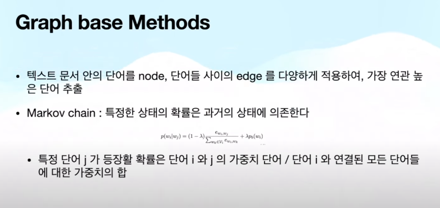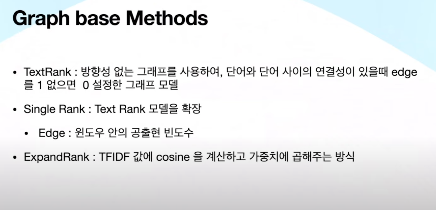 통계적 기반이 아닌 그래프 방법에 기본적인 아이디어는 텍스트 문서 안의 단어들을 노드로 설정하고 그 단어들과 단어들 사이의 edge값을 다양하게 적용해서 단어들 사이에 연관이 높은 단어를 추출하는 아이디어를 가진 모델입니다.