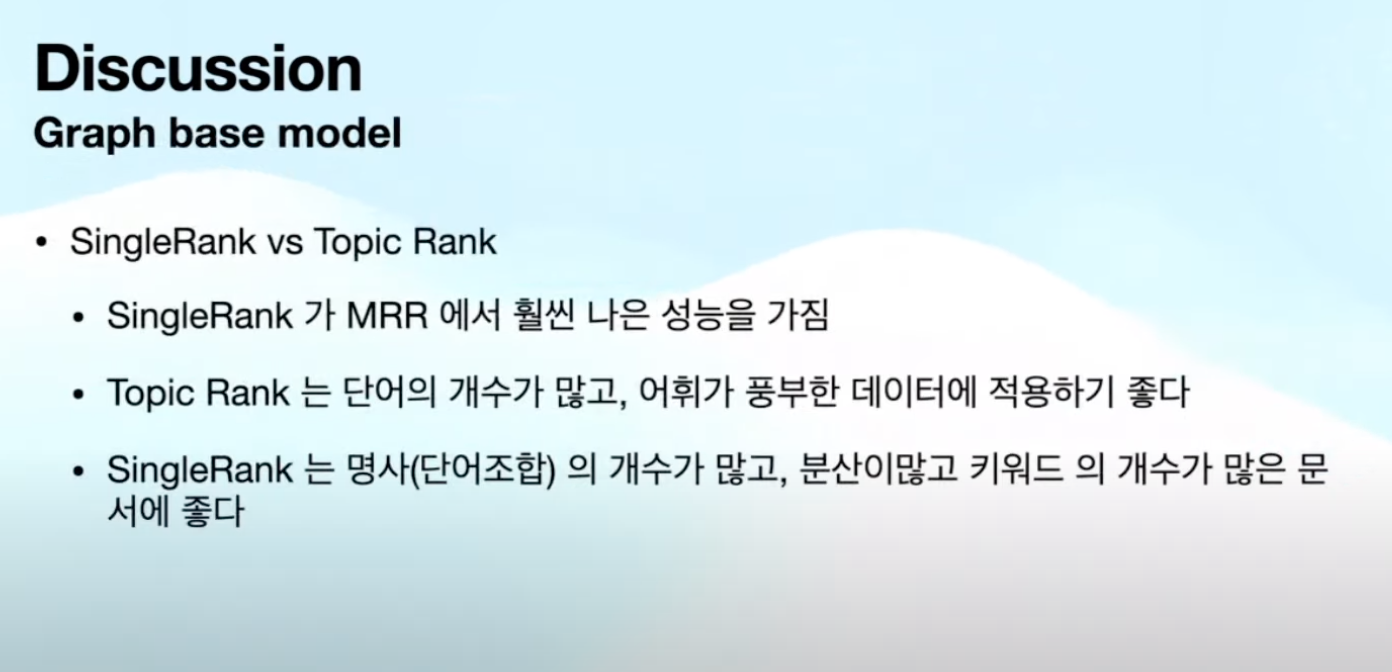 SingleRank는 안정적으로 평균적으로 많은 명사의 조합이 있을 때 그리고 단어의 분산도가 많을 때 키워드 종류가 많은 경우에 높은 성능을 가집니다. 이 그래프 기반에 SingleRank는 문서의 다양한 단어가 많이 나오고 중요한 키워드가 여러 개가 배치되어 있고 그리고 어휘가 풍부한 문서일수록 효과가 뛰어납니다.