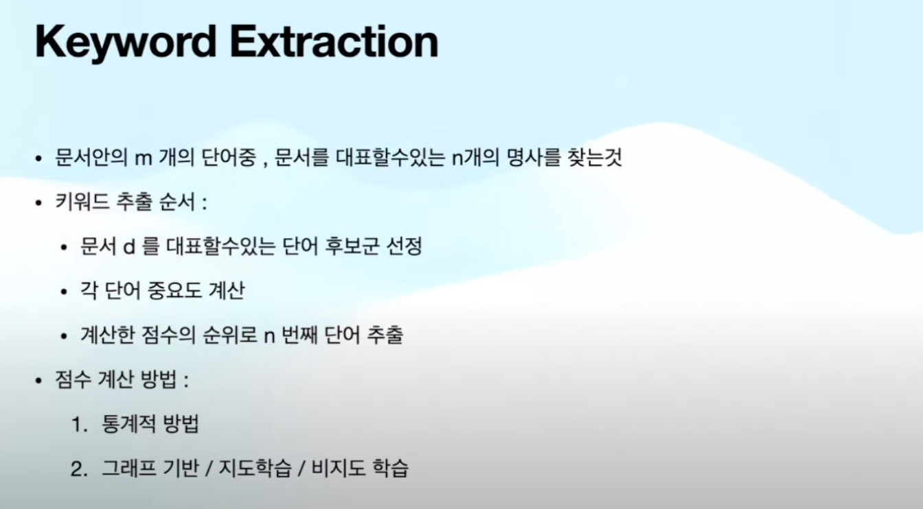키워드 추출은 문서 안에 여러 개 m개 단어 중에 문서를 대표할 수 있는 n개의 명사를 찾는 것입니다.