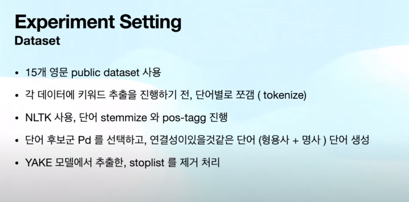 그리고 그래프 모델로서는 TextRank, SIngleRank, Position Rank, SingleTPR, Topic Rank 이렇게 다섯 개의 그래프 모델들을 사용했습니다.