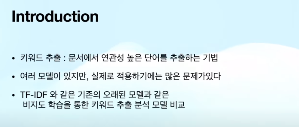 여러 많은 지도학습과 인공신경 모델이 있지만 조금 더 실용성이 높은 이 논문에서는 초기 비지도학습을 이용한 키워드 추출 분석 모델을 비교해보고자 합니다.