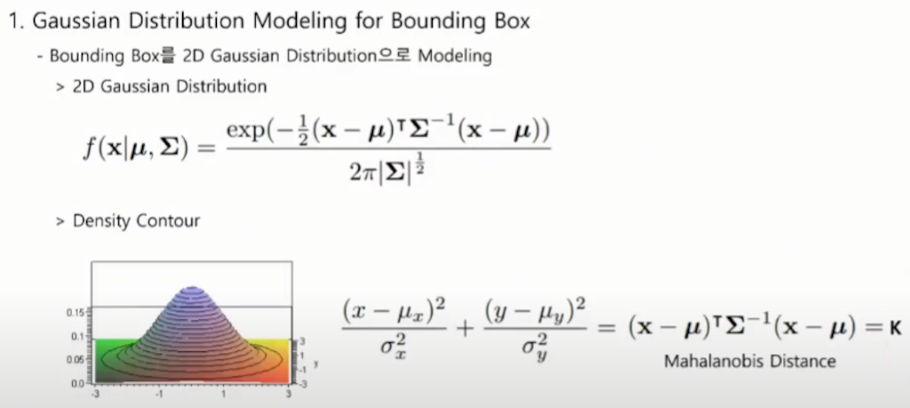 Bounding Box Component를 가지고 타원 방정식을 구해서 Density Contour까지 구해보겠습니다. Bounding Box가 있을 때 내접하는 타원의 Component는 중심점 그리고 width랑 height가 있습니다. 위에서 설명드린 Mahalanobis distance가 1일 때 타원 방정식과 Density Contour 방정식은 서로 매칭이 될 수 있습니다. U는 일반적으로 Gaussian Distribution에서 말하는 평균값이고 ∑는 공분산 행렬입니다.