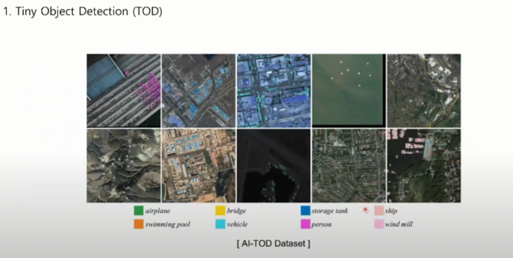 작은 것들을 내포하는 데이터셋은 대표적으로 AI TOD(Tiny Object Detection) 데이터셋이 있습니다. Tiny Object Detection에서는 Tiny랑 very Tiny까지 포함되어 있습니다. Tiny는 8 X 8부터 16 X 16이고, Very Tiny는 그 이하를 의미합니다.