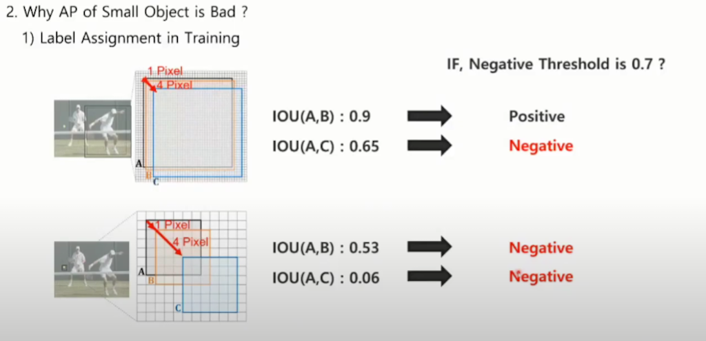 IoU가 어떤 영향을 끼치는지 살펴보겠습니다. 그림에서 A 가 GT(Ground Truth)고 B와 C가 예측된 박스라고 생각했을 때 IoU는 0.9입니다. 일정 Threshold이하면 모두 Negative Sample으로 할당돼서 악영향을 끼칠 수도 있습니다. Tiny Object에서 IoU를 사용하면 빈번하게 발생할 수 있는 문제라고 설명하고 있습니다.