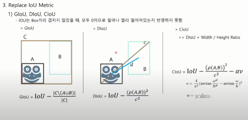 IoU 문제를 해결하기 위한 방법입니다. GIoU, DIoU, CIoU 은 IoU를 대체하기 위해서 나왔습니다. 두 박스가 겹치지 않을 경우에는 IoU가 0으로 떨어지기 때문에 얼마나 박스가 떨어져 있는지 확인을 못 하기 때문에 두 박스 사이의 거리나 면적들을 가지고 IoU를 보완하겠다 라는 개념입니다.