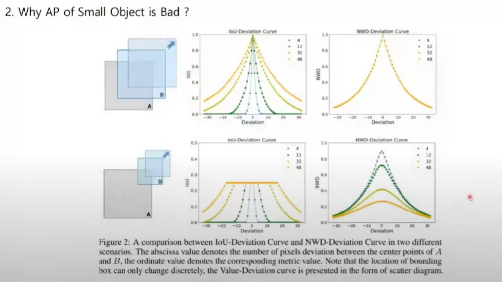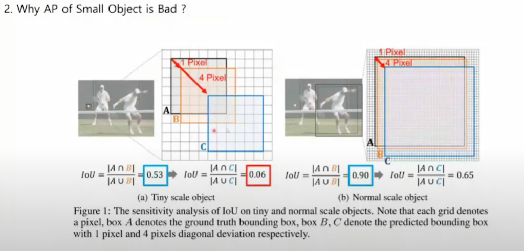 왜 IoU가 Small Object를 탐지하는데 문제가 되는지 설명드리겠습니다. 왼쪽이 작은 크기의 박스고 오른쪽이 큰 크기의 박스입니다. 박스 B와 C는 각각 A 박스를 기준으로 1 Pixel, C는 4 Pixel이 translation 되어 있습니다. 왼쪽 A와 B 의 IoU를 보시면은 0.53이고 오른쪽 A와B는 0.9 입니다. 같은 크기만큼 translation이 되었음에도 불구하고 IoU값이 차이가 나는 것을 확인할 수 있습니다. 4 Pixel이 움직인 A 와 C는 IoU가 0.65이고 크기가 작은 박스에 경우 0.6인 것을 확인할 수 있습니다. translation시 박스 크기에 따라서 metric이 변한다라는 게 IoU의 문제라고 설명하고 있습니다.