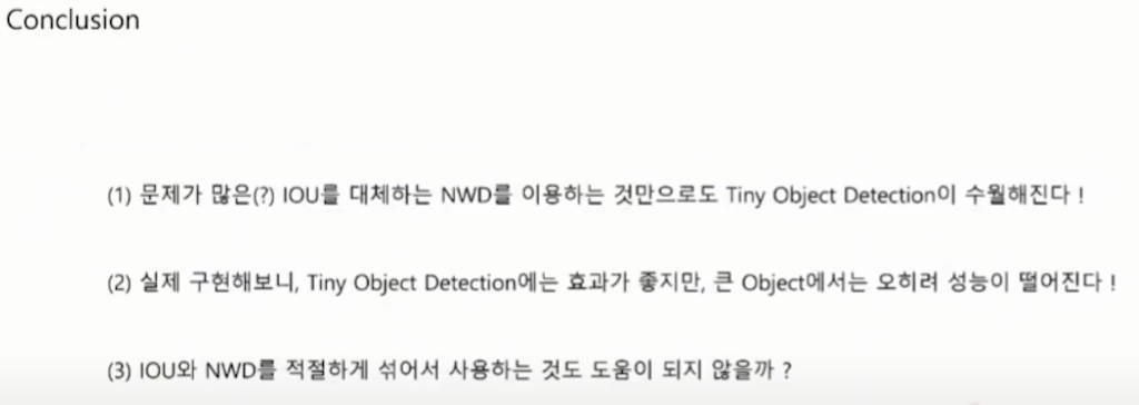 결론을 내자면 IoU를 대체하는, NWD 사용하는 게 되게 간단한 방법이고 코드 구현도 간단하면서 효과적으로 Tiny Object Detection을 수행할 수 있습니다. 그러나 실제 구현해보니 큰 Object에는 오히려 성능이 떨어지는 것을 확인할 수 있었습니다.