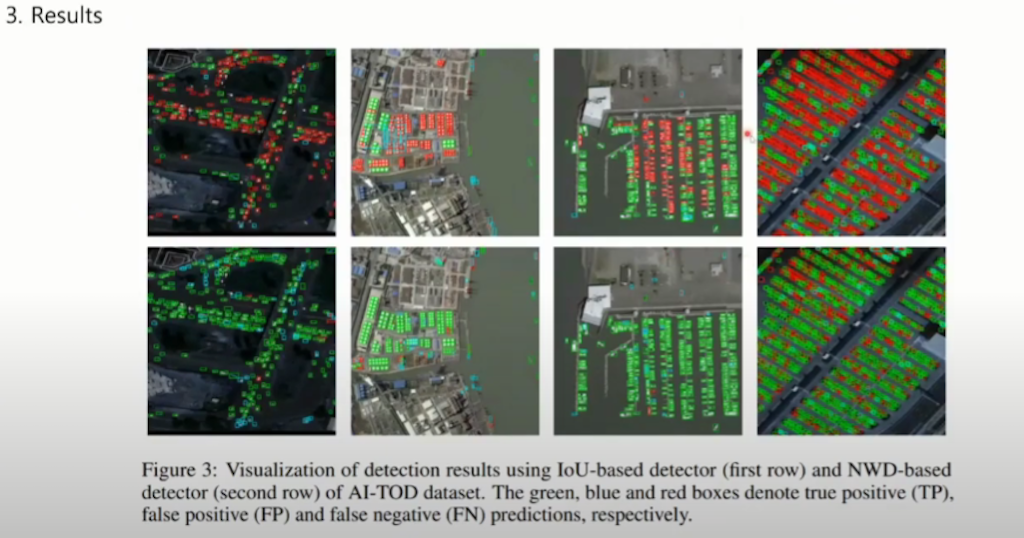 실제 실험 결과입니다. 위쪽은 IoU를 사용했을 때 밑에는 NWD를 사용했을 때입니다. 초록색은 잘 찾은 부분이고, 빨간색은 찾아야 되는데 못 찾은 부분, 파란색은 못 찾아야 되는데 찾은 부분입니다. NWD를 사용하는 게 효과적인 것을 확인할 수 있습니다.