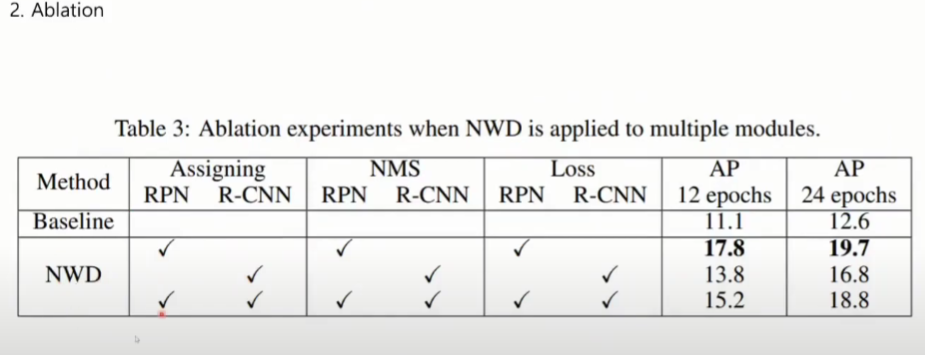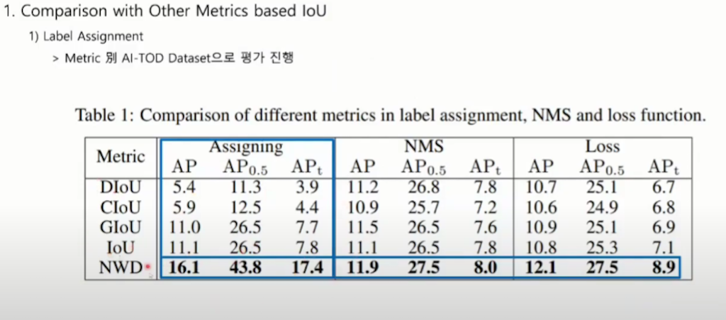 Experiments 부분입니다. 실험에서 사용한 Baseline 네트워크는 Fast R CNN을 사용했습니다. 다른 metric과 비교해 봤을 때 Tiny Object Detection에서 제일 효과가 좋은 것을 확인할 수 있습니다. 다른 metric들을 적용해봐도 효과가 별로 안 좋은데 NWD를 적용했을 때 효과가 좋은걸 확인할 수 있습니다.