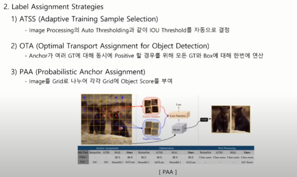 Label Assignment은 수많은 박스들 중 ground truth를 선정하는 방법입니다. 보통은 ground truth와 가장 IoU가 높은 예측 박스 중에 선정을 해서 ground truth를 계산합니다. 이때 IoU가 작은 물체는 Negative Sample, 즉 background라고 생각합니다. 혹은 ground truth가 가장 높은 것은 Object라고 생각하고 Loss를 계산합니다. 일반적으로는 IoU Threshold를 미리 정해 놔서 일정 IoU이하는 전부 Negative Sample로 결정하는 박스 Assignment를 합니다.