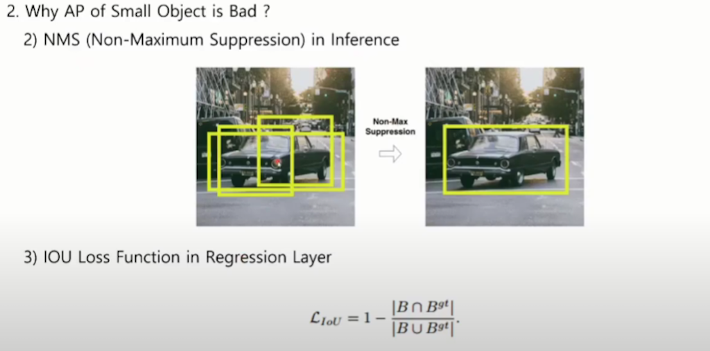 다음은 NMS(Non-Maximum Suppression)입니다. IoU가 사용되는 부분은 NMS에서도 사용됩니다. NMS는 inference에만 사용되긴 하지만 NMS에서도 IoU가 사용되기 때문에 문제가 될 수 있다고 설명하고 있습니다. 또한 IoU Loss를 사용하는 Regression Layer에서도 학습과정에서 악영향을 끼칠 수 있다라고 설명을 하고 있습니다.
