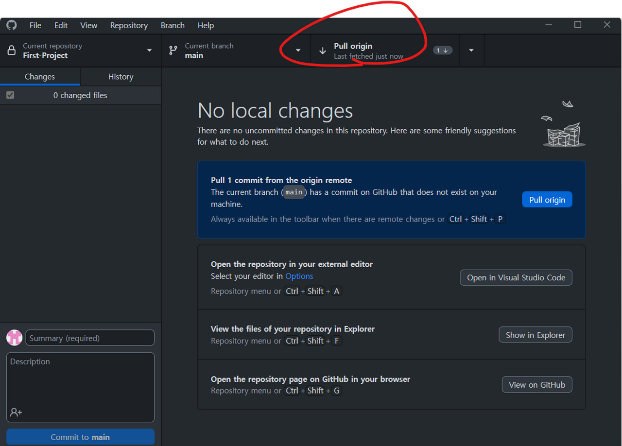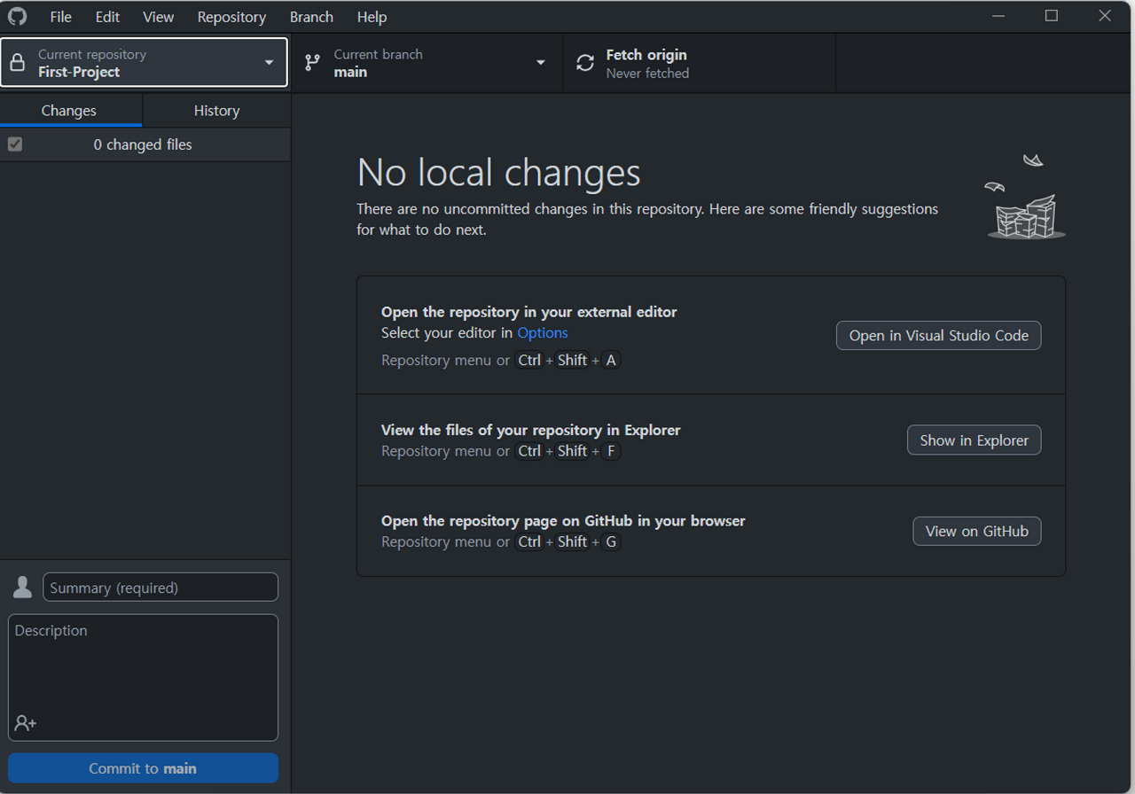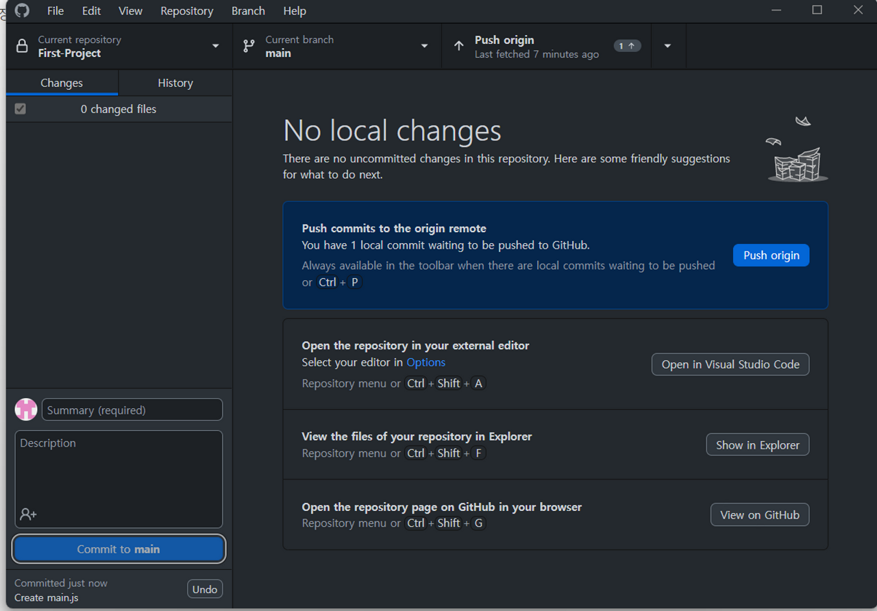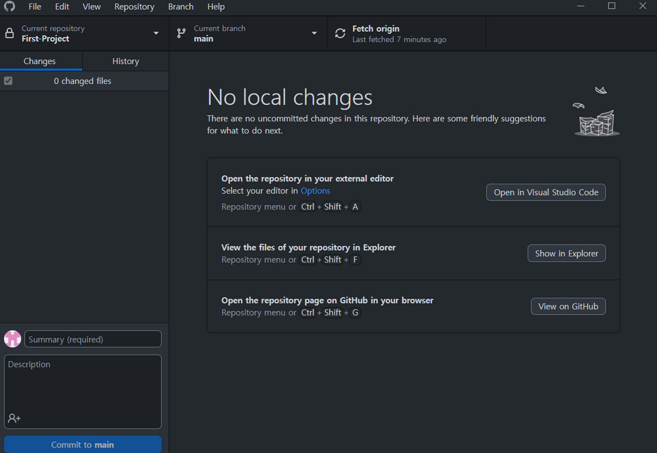 GitHub Desktop을 열어보면 좌측 위 Current repository에도 역시 First-Project가 설정 되어있습니다.