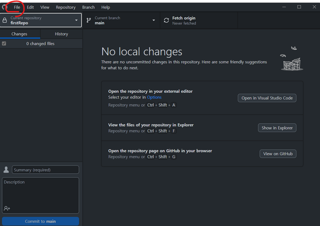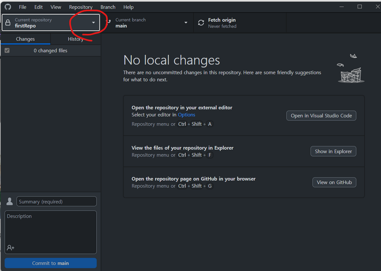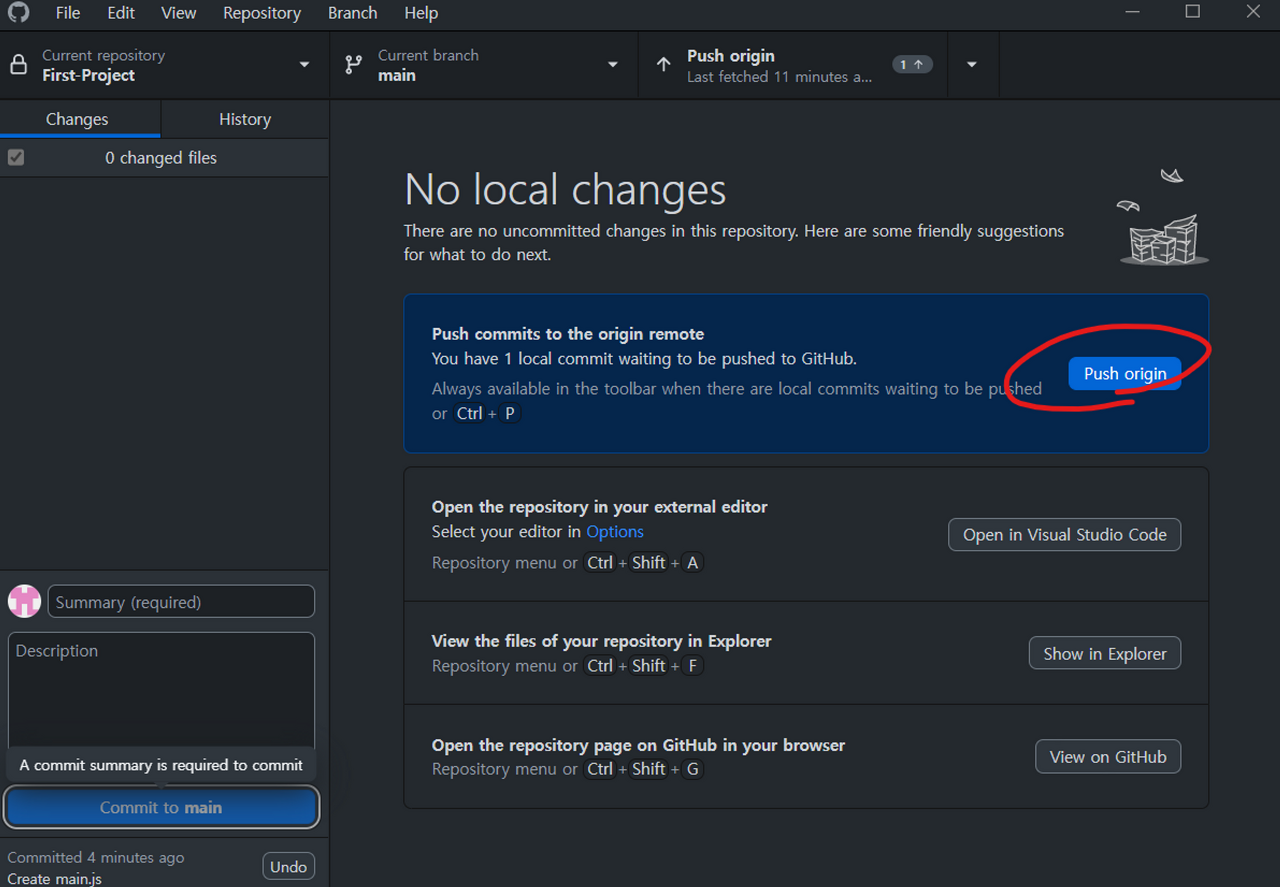 GitHub Desktop을 열어보면 좌측 위 Current repository에도 역시 First-Project가 설정 되어있습니다.
