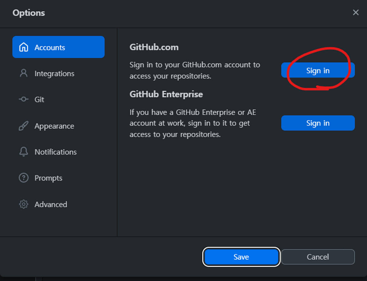 좌측 위 File > Options > Account> Sign in을 통해 깃헙 로그인을 해줍니다.