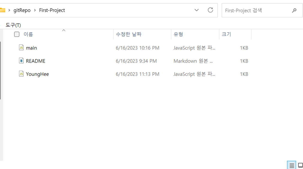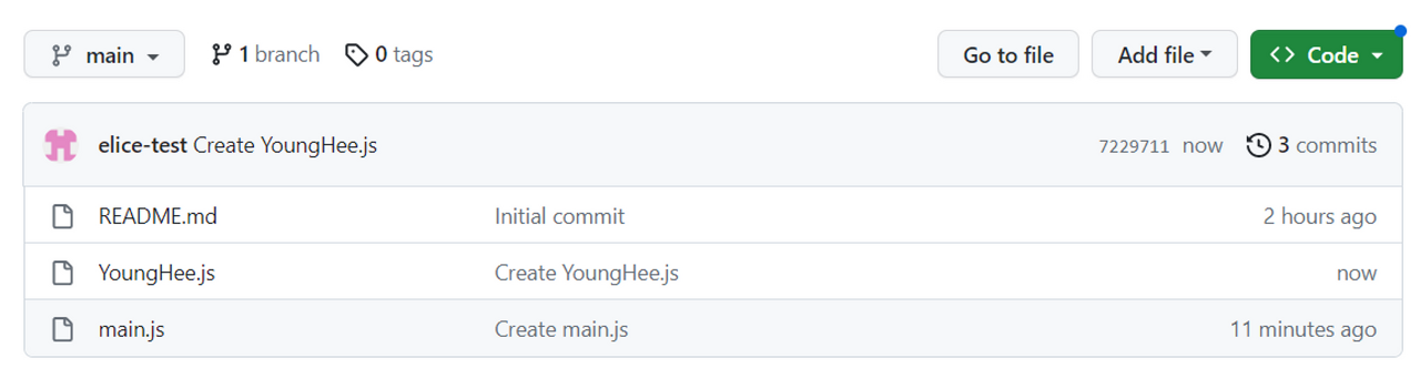 자 이런식으로 YoungHee.js파일이 만들어졌고, commit도 이제 3 commits가 되었네요?