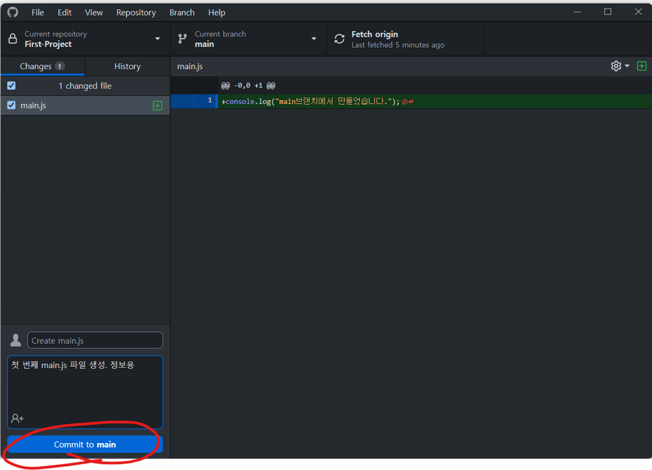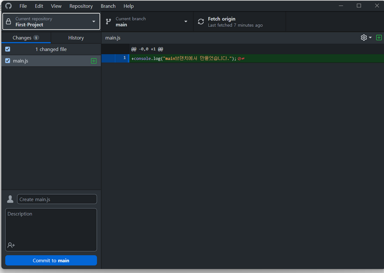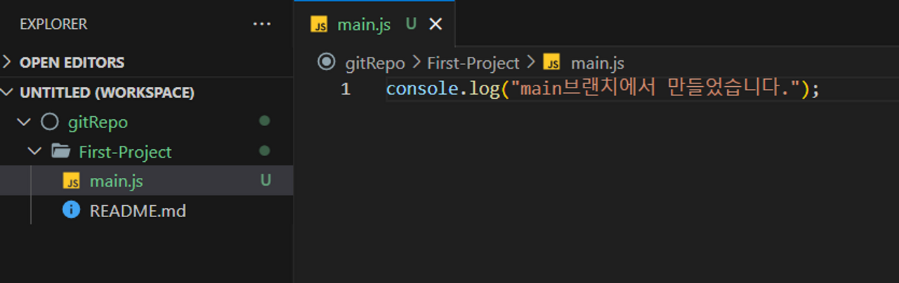 First-Project 폴더 안에 main.js를 만든 뒤, “main브랜치에서 만들었습니다.”를 입력해봅시다.