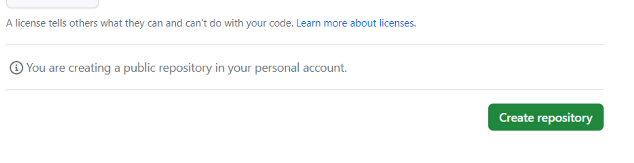 - Choose a liscence : 내가 만든 레포지토리에 작업물에 대한 사용 권한, 배포 조건, 저작권 등을 명시하는 규약입니다. 일단은 넘어갑니다.