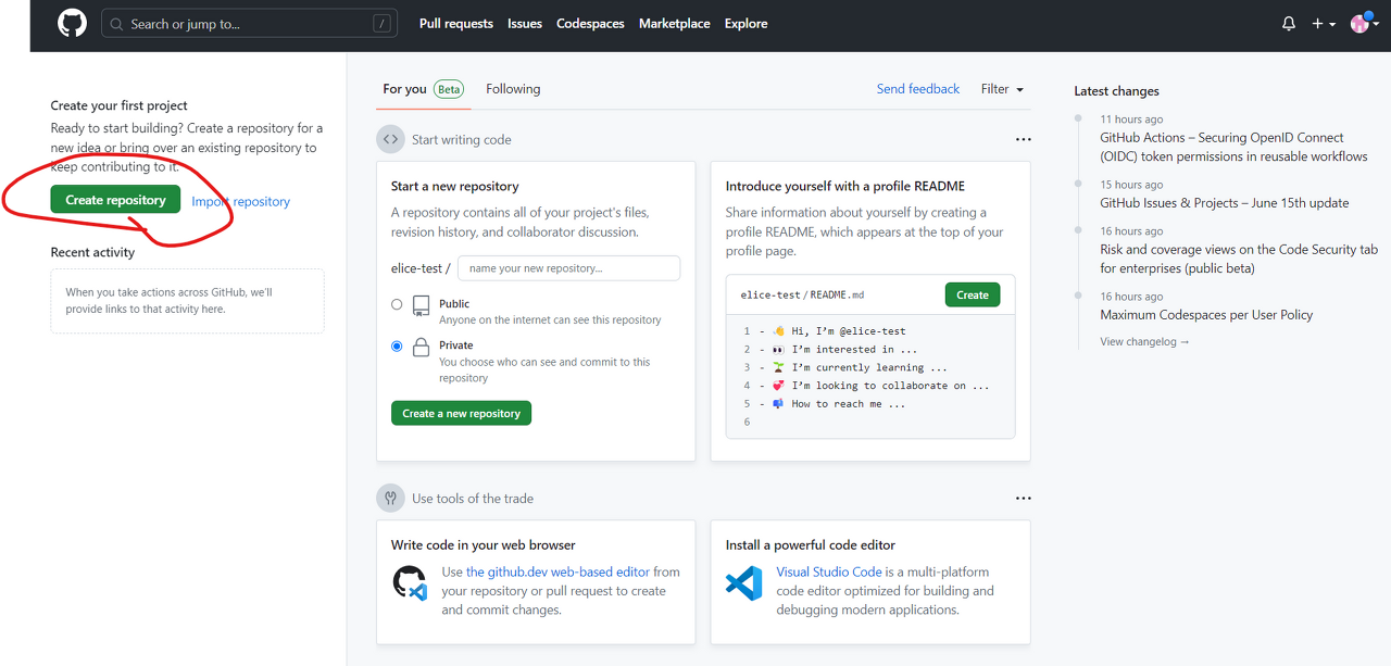 좌측에 초록색 버튼으로된 “Create repository”를 눌러줍니다.