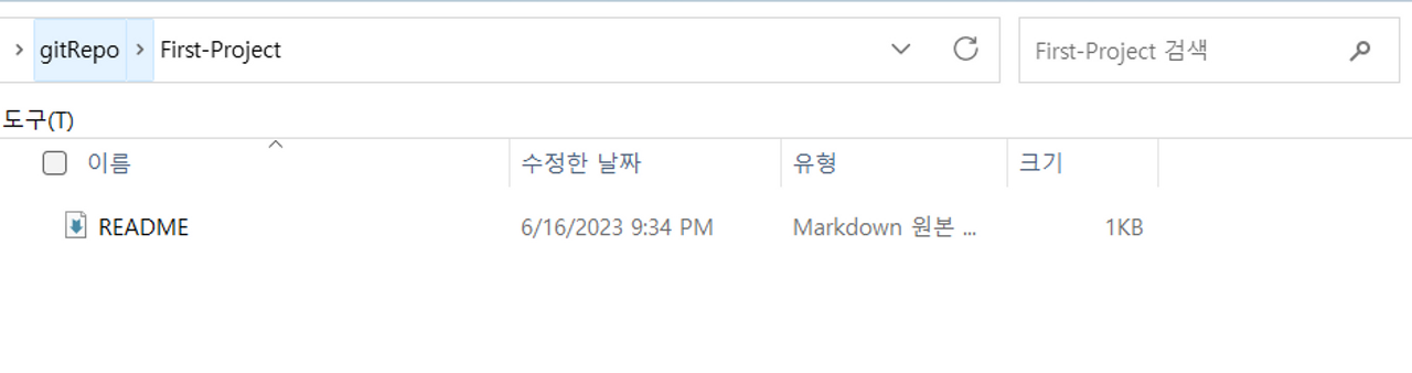 First-Project 폴더에 들어가보시면 READEME라는 파일이 있는 것을 알 수 있죠. 왜 있을까요? 깃헙 원격저장소를 clone했으니 당연히 원격저장소 내에 있는 파일이 같이 clone된 것입니다.
