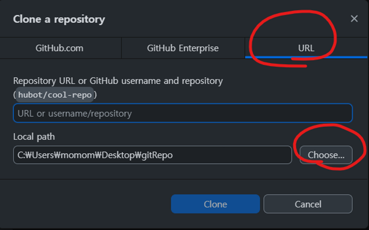 Choose를 눌러 바탕화면에 만들어준 gitRepo를 설정해줍니다.