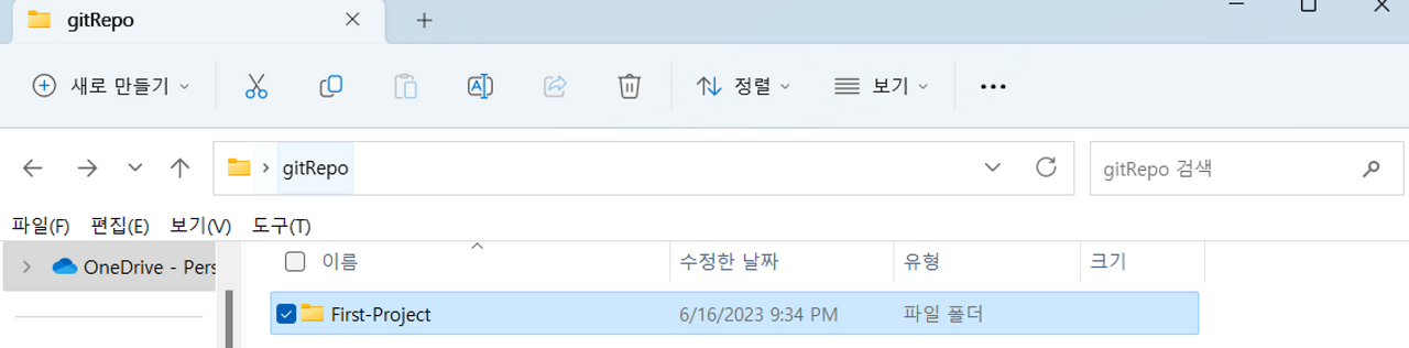 그러면 gitRepo 폴더에 “First-Project”라는 폴더가 생겼습니다!