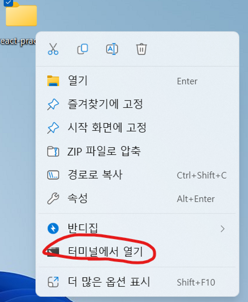 - 바탕화면에 react-practice라는 폴더를 만듭니다.
