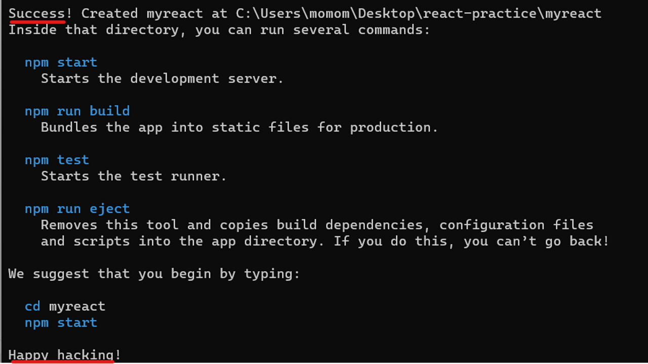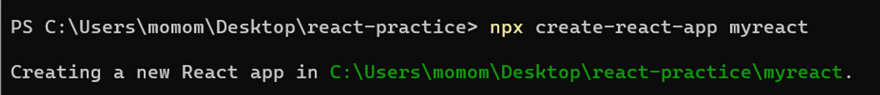 눈치빠르신 분은 벌써 알아차리셨겠지만 우리가 조금 전 ‘npx create-react-app myreact’ 명령어를 입력할 때 입력했던 맨 마지막 문구인 ‘myreact’가 바로 우리가 만들 리액트 프로젝트 폴더 이름입니다.