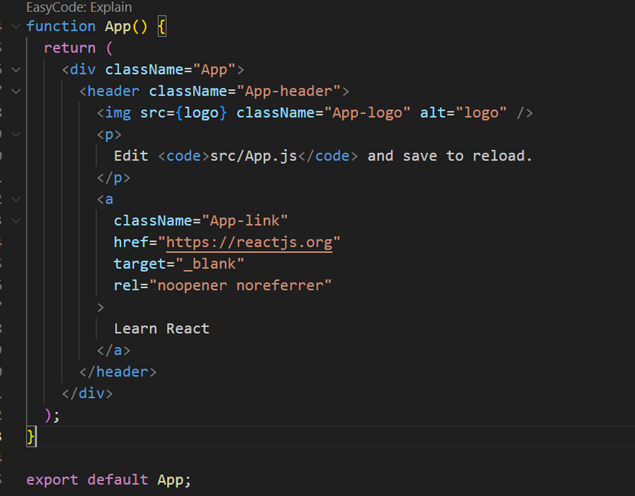 우리는 App.css 파일 밑에 있는 App.js 파일을 열어볼 차례입니다.