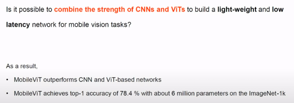 CNN과 ViT의 장점만을 살려서 mobile vision task에 적합한 가볍고 latency가 낮은 모델을 설계하는 것이 가능한지에 대한 질문입니다. 결과적으로 Mobile ViT와 CNN이나 ViT만을 기반으로 한 네트워크보다 좋은 성능을 달성을 했고 단 600만 개의 파라미터만을 가지고 ImageNet에서 78.4%의 정확도를 달성한 것을 확인할 수 있습니다.